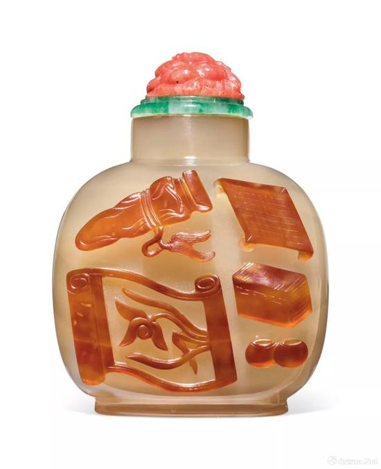 拍品编号744 1770-1850年玉髓玛瑙雕四艺图鼻烟壶 高5.7 cm 估价: 美元 6,000 - 8,000