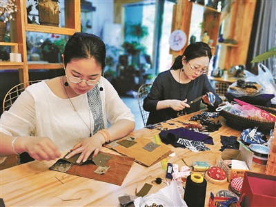 日前,在浙江宁波宁海县前童古镇明德书院内,几名巧娘正在制作具有地方特色的文创产品:将布染成蓝色,放进中草药,扎成挂件、香囊。几名游客举起手机,一边用镜头记录巧娘飞针走线,一边赞叹工艺品的精美。