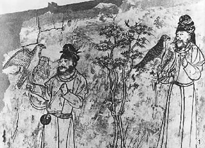 唐代懿德太子李重润墓留存了胡人架鹰擎雕壁画(图①),金乡县主墓里胡人骑马狩猎俑中也有手持鹞隼者,都生动描绘了当时的皇家贵族的野猎生活。胡人驯鹰师一只手臂举着猎鹰,另一只则擎起猎隼鹞,画师描绘猎师臂架鹰时图画有所改动,原来猎鹰移动位置被误认为是两只鹰,实际还是一只猎鹰(图②)。