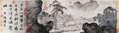 图的右上角有清乾隆皇帝御笔题记:“记得惠山精舍里,竹罏沦茗绿杯持。解元文笔闲相仿,消渴何劳玉虎丝。甲戌闰四月雨余,几暇偶展此卷,因摹其意,即用卷中原韵题之,并书于此。”乾隆皇帝也是品茗大家,民间流传很多乾隆与茶的故事。乾隆帝曾有一首《荷露煮茗》诗云:“平湖几里风香荷﹐荷花叶上露珠多。瓶罍收取供煮茗﹐山庄韵事真无过。”乾隆六次南巡,有四次在杭州视察茶场。1757年,乾隆皇帝第二次南巡,来到杭州后,接受上一次被地方官员蒙蔽的教训,仅带几个随从,去偏僻的云栖地区微服私访。乾隆看着忙忙碌碌的茶农,个个穿着破烂的衣衫,在田间吃着粗陋的饭食。他在《观采茶作歌》诗中曰:“由来贵诚不贵伪,嗟哉老幼赴时意;敝衣粝食曾不敷,龙团凤饼真无味。”表现了乾隆对茶农劳作辛苦的怜悯。乾隆传位嘉庆帝时,大臣们劝谏说:“国不可一日无君。”乾隆端起茶杯曰:“君不可一日无茶也。”他晚年退位后,把品茶作为延年益寿之道,在北海镜清斋内专设“焙茶坞”,悠闲品茗,悠哉乐哉。他以88岁而善终,与饮茶养生有很大关系。(郑学富)