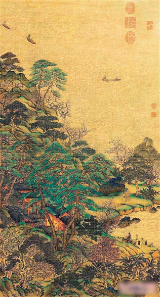 整幅画呈现出精巧瑰丽、工细典雅、富丽堂皇的艺术特点。精细匀称的铁线勾画出山石树木之形态,线条硬朗且疏密有别;画面设色浓厚,以石青、石绿为主,用金粉提色,山石罩染数次,这种以青绿为质、金碧为纹,阳面涂金、阴面加蓝的技法,使得画面整体繁茂厚重、金碧辉煌,极富装饰性。