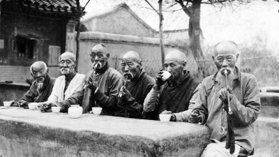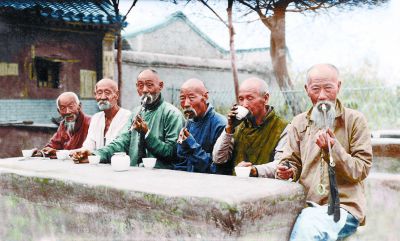 几位老人坐在石桌旁,有的在抽旱烟,有的在喝茶,细看还有两位老者在揉核桃。他们都曾经是八旗士兵。