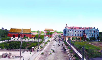 这是由南向北拍摄的户部街。户部街在千步廊东侧,即今天广场东侧道路。路西是中华门和棋盘街花园,远处可见天安门及部分紫禁城宫殿;路东近处的空地是美军操场。1901年的《辛丑条约》规定,东交民巷使馆区周围划定一片区域作为各国驻军的操场。美军操场北面是东交民巷,巷西口矗立着一座牌楼,上书“敷文”二字匾,牌楼北是法国医院。