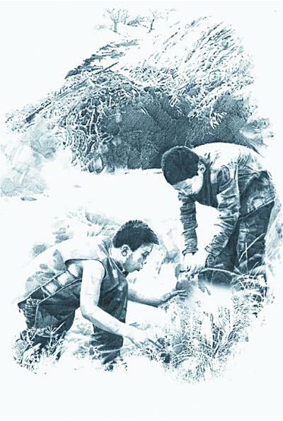 “嘘,别说话,看我逮住它!”他们在抓什么?或许是一只蚂蚱,或者是一只蟋蟀,抑或是一只兔子,画里我们看不到,但我们可以猜想,扒拉开这片草,目标就要出现。想起幼时在割过禾的稻田里,禾垛一个个竖立,像小小的帐篷,伙伴们最大的乐趣,就是拽住禾垛,一个个翻开,一不留神,就会蹦出一只青蛙,呱!