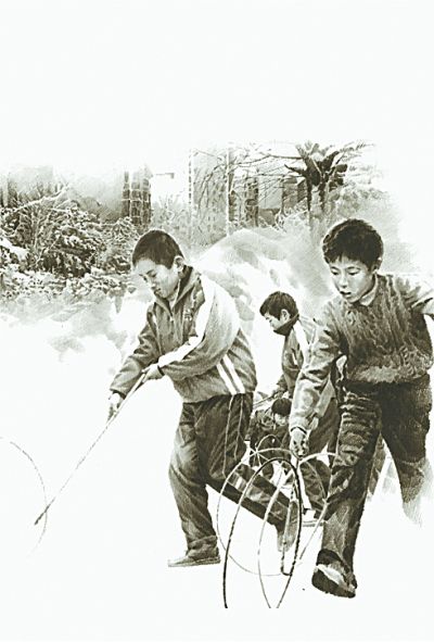 那些年,家里木桶坏了,总有一个孩子暗自开心。木桶坏了,箍桶的铁环就可以用来做滚圈了,哈哈!再让爸爸找一根铁丝,稍微加工一下,就是“赶圈”的杆儿了。滚圈可流行了,幼儿园亲子活动,小学生校园比赛,只要有块平地,铁圈就能滚起来。摩擦摩擦,一路火花才厉害呢!