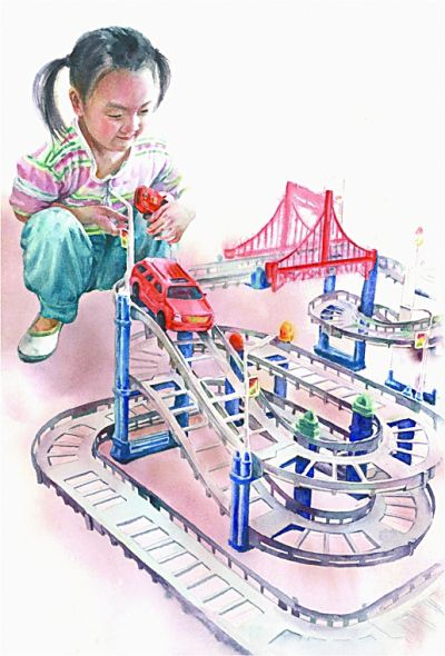 时代的发展,体现在小小的玩具里。汽车多了,高架桥多了,这样的玩具也多了。童趣也总是体现在玩具的“模拟现实”里:现实的桥梁高大无比,人在其中显得渺小,但面对玩具,孩子才是高大的。俯瞰着高架桥,掌控着“车流”,你看,这辆车我想怎么放就怎么放!
