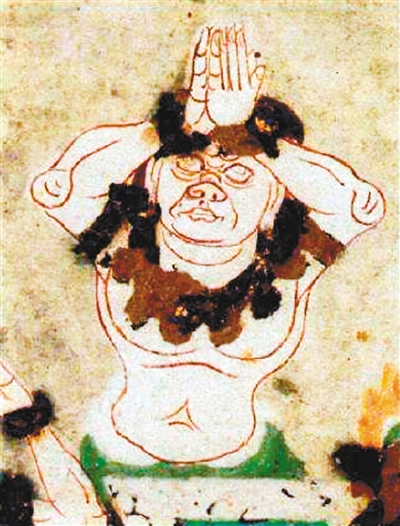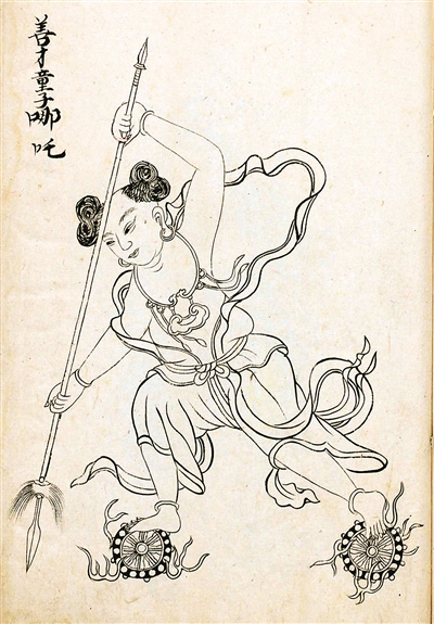 早期的哪吒是个什么样子呢?法国巴黎国家图书馆现藏有一幅《大圣毗沙门天王像》,此作纵39.4厘米,横25.5厘米,为五代时期的雕刻印刷品,盗自敦煌藏经洞。画面主要描绘毗沙门天王,但最引人注目的却是天王像右上方,面目狰狞的罗刹右手中高举的一个婴儿。这幅画的内容是一则西域神话故事:西域于阗国王自认为是毗沙门天王的后代,国王耆老之后,没有子嗣,祈请毗沙门天王赐子。随后毗沙门天王显灵,从额头剖出婴孩,于阗国才得以传承。有学者认为,图中的婴儿既是毗沙门天王之子,那么很可能就是“哪吒”。