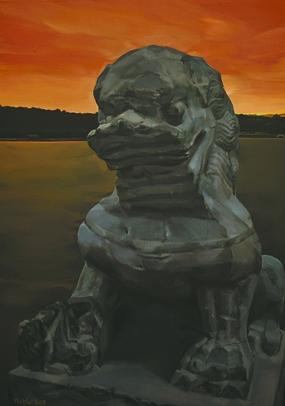 这些记忆有时候会幻化变形,融汇在杜汇的画里。比如他的《紫禁》画的不是故宫,而是某个公园桥头上的一尊石狮子。杜汇为了把自己记忆里那只“有历史沧桑感的石狮子”表现出来,用丙烯画一遍,刮下去一半,再画再刮。直到“打磨出历史的层叠感和堆积感”,因为这样才有“老照片的痕迹感”。画完前景的狮子,杜汇在远处画上了一艘若隐若现的脚踏船,在他看来这是“历史与现实的呼应”。