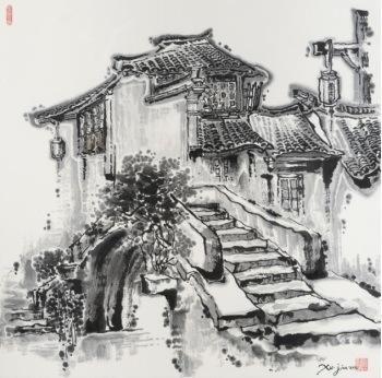 徐建新对江南水乡独有情韵,以及对苏州园林的人文景观情有独钟且深有慧心。他的很多作品从苏州古典园林的典雅灵秀和完美意境中得到启发,颇有清新、秀美、多变之趣。他画的江南水乡,尽情展现黑白之美、结构之美。黑白乃老庄思想,老子提出“知白守黑,为天下式”,庄子直接说:“朴素而天下之莫能与之争美”。徐建新画的古镇周庄、苏州园林等写生之景,多数不采用全景式,而采用特写式,即截取中景,浓重的黑色屋顶下是白色的墙,房与屋之间上下左右大块白与小块黑的重量感对照,充分运用点、线、面,将白色的素纸与块面的黑色相参,将结构、形体有机地统一在一起,呈现出舒畅盎然之生机。如此一来,江南水乡特有的黑瓦白墙、清丽明媚和明快动人的情调便跃然纸上。通过明快灵动富于表现力的笔墨,画家对江南水乡的挚爱情怀得到了生动完美的表达。