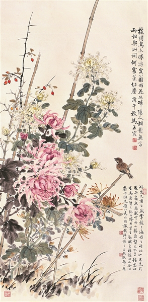 丛菊篱雀图 马孟容1930年作 马公愚1952年题