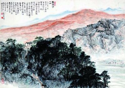 画家用精湛的笔墨,淋漓尽致地描绘了云石山的景貌。远处山峦起伏,近处茂林密集,树林中隐约可见一条通向山顶庙宇的羊肠小道,空灵之境引人遐想。