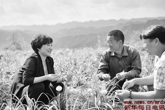 ▲余留芬(左)在岩博村的韭菜地里与村民交流明年的种植计划(10月9日摄)。 新华社记者陶亮摄
