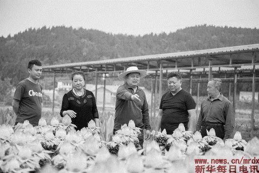 ▲蒋乙嘉(中)在为村民讲解千叶佛莲的生长习性(5月9日摄)。 新华社发(蒋东宏摄)