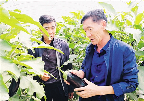 胡中山(右)在农户日光温室中查看蔬菜长势。陈发明摄