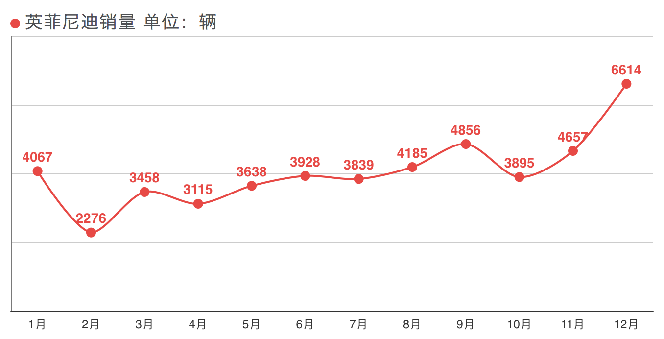 然而,到了2017年下半年,英菲尼迪就像是开挂般的销量往上串。尤其是到了12月,销量像打鸡血一样猛增至六千多辆,变成了通勤款。陆逸提到嗓子眼儿的心也终于归位,“下课”是暂时不会了。