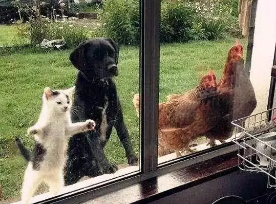 (一猫一狗就这样大摇大摆地走向养鸡场里面去了)
