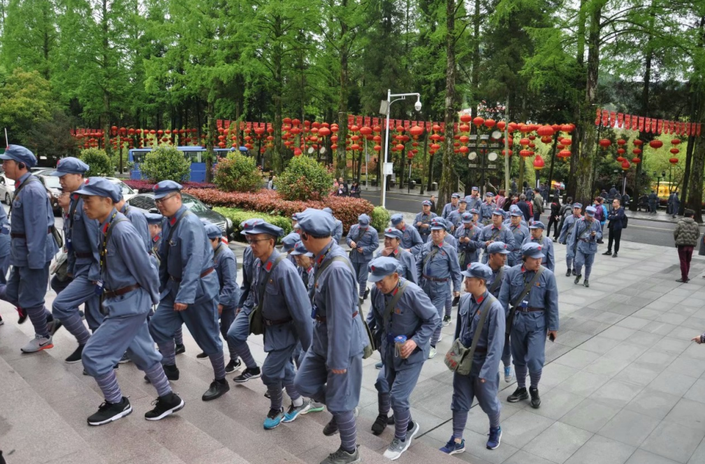 此时的博物馆,游人不可谓不多,许多不同的团队,排着整齐的队列,陆续进场。他们大部分身着红军粗布衣,头戴八角帽,肩背红书包。博物馆前,不断有团体照相留念。