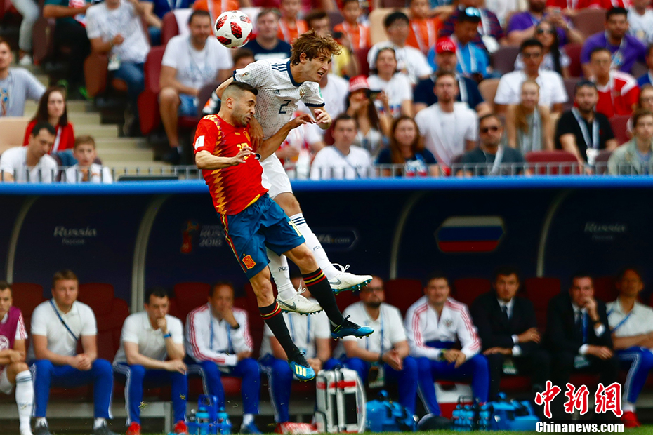 比赛一开场,以传控体系见长的西班牙队逐渐掌握场上主动,控球率一度高达72%。东道主俄罗斯队积极防守,借机寻找反击机会。第11分钟,阿森西奥主罚定位球,争抢中,俄罗斯后卫伊格纳舍维奇在贴身防守拉莫斯时不慎将球挡进了自家大门,送上乌龙大礼,西班牙1:0领先东道主。 中新社记者 富田 摄