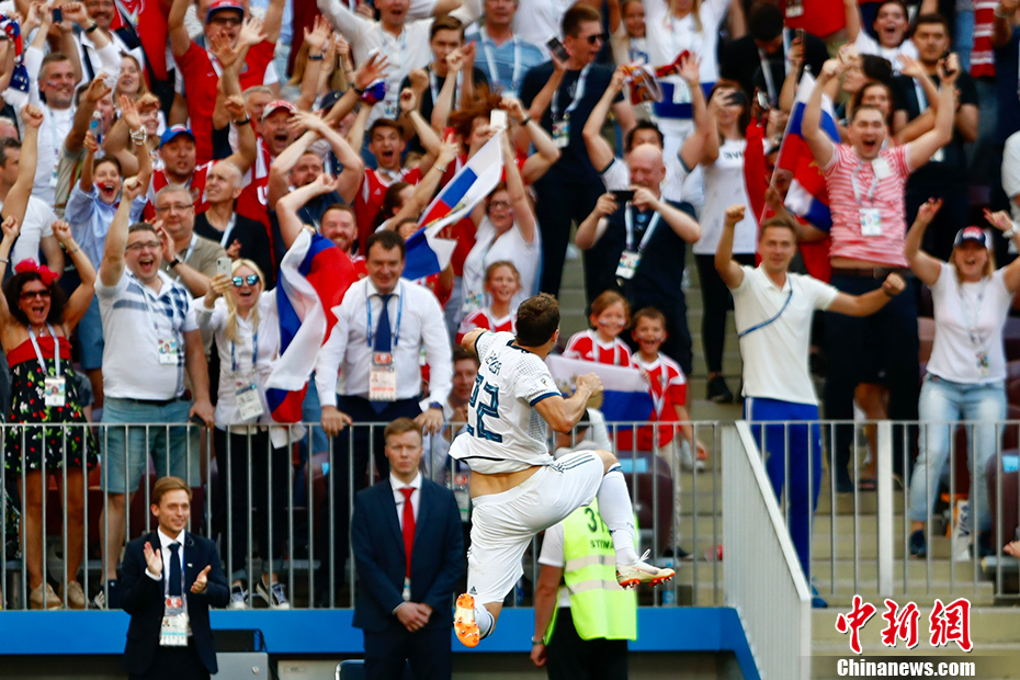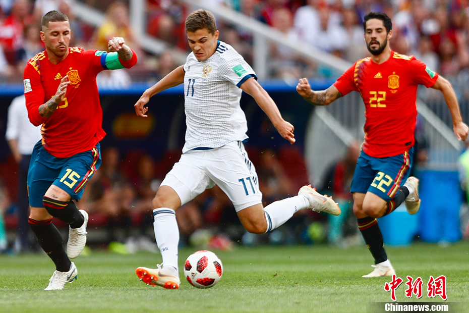 下半场易边再战,双方基本保持了上半场的攻防节奏。俄罗斯队连续做出3次换人调整:用格拉纳特换下日尔科夫,切里舍夫换下萨梅多夫,斯莫洛夫换下高中锋久巴。西班牙做出相应的换人调整,由“老白”伊涅斯塔换下大卫-席尔瓦,卡瓦哈尔换下疑似受伤的纳乔。第79分钟,西班牙队做出换人调整,阿斯帕斯换下科斯塔。至此,双方高中锋全部换下。图为戈洛文在赛场上。 中新社记者 富田 摄