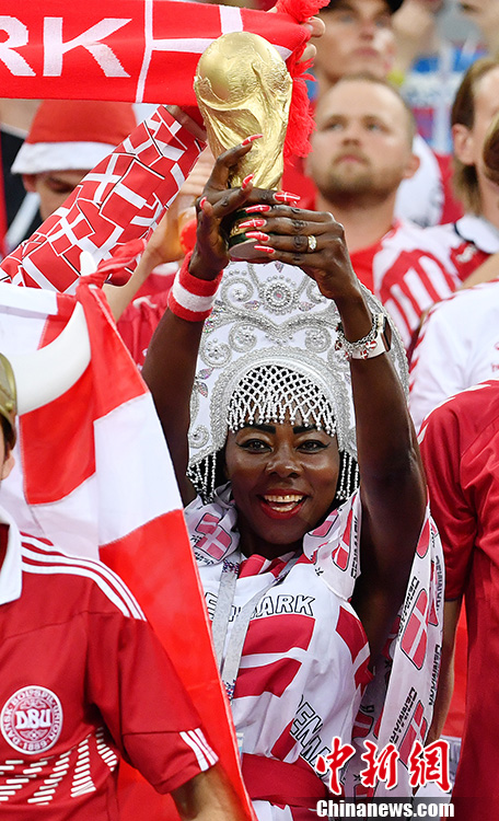 一位丹麦球迷手持“大力神杯”。 中新社记者 毛建军 摄