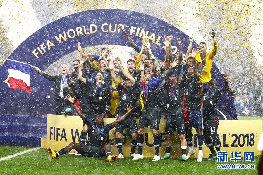 ↑图为2018年7月15日,在莫斯科进行的2018俄罗斯世界杯足球赛决赛中,法国队球员在颁奖仪式上庆祝。法国队以4比2战胜克罗地亚队,继1998年后再夺世界杯冠军。 新华社记者曹灿摄