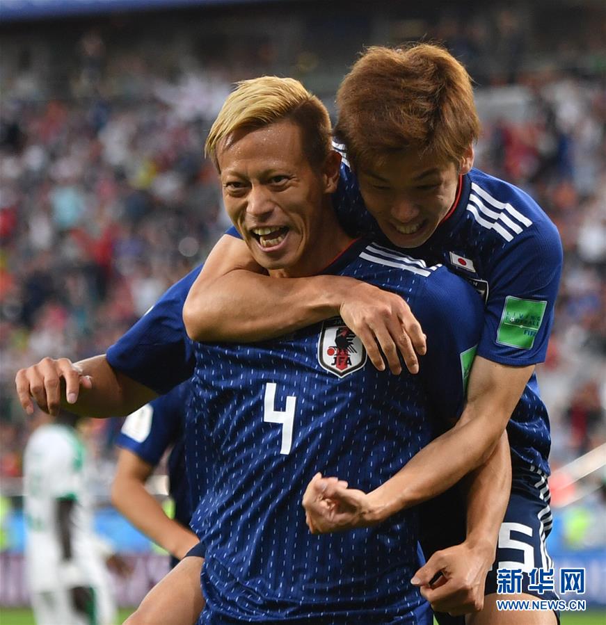 ↑图为2018年6月24日,在叶卡捷琳堡进行的2018俄罗斯世界杯足球赛H组小组赛日本队对阵塞内加尔队的比赛中,日本队球员本田圭佑(左)在进球后庆祝。最终,日本队以2比2战平塞内加尔队。 新华社记者刘大伟摄