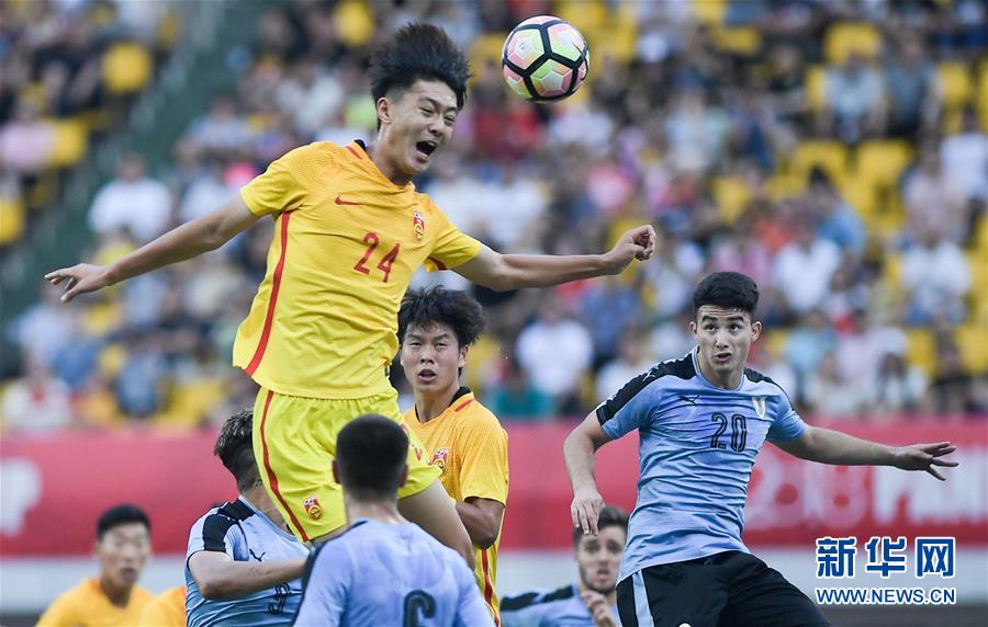 ↑图为2018年5月27日,在四川成都举行的2018“熊猫杯”国际青年足球锦标赛中国U19国家青年队对阵乌拉圭U19国家青年队的比赛中,中国队球员蒋圣龙(上)在比赛中争顶。最终,中国U19国家青年队以3比1战胜乌拉圭U19国家青年队。 新华社记者薛玉斌摄