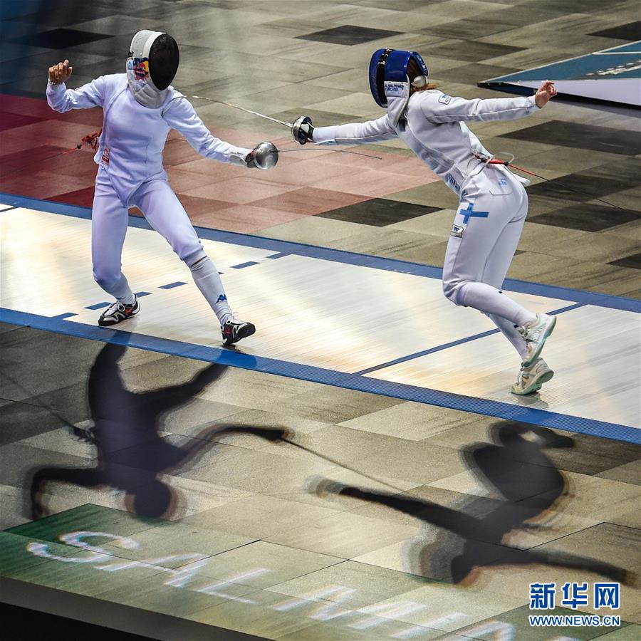 ↑7月19日,在女子重剑个人资格赛中,意大利选手菲亚明戈(左)以5比0战胜芬兰选手萨尔米宁。 当日,2018世界击剑锦标赛在江苏省无锡市新体育中心体育馆开赛,本次赛事共有来自108个国家和地区的运动员争夺三个项目的男女个人和团体冠军。 新华社记者李博摄
