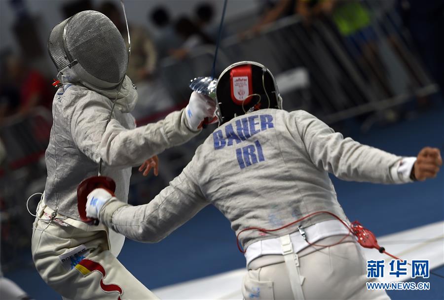 ↑7月19日,中国选手许英明(左)在比赛中。他在男子佩剑个人资格赛中以5比4战胜伊朗选手巴赫尔。 当日,2018世界击剑锦标赛在江苏省无锡市新体育中心体育馆开赛,本次赛事共有来自108个国家和地区的运动员争夺三个项目的男女个人和团体冠军。 新华社记者韩瑜庆摄