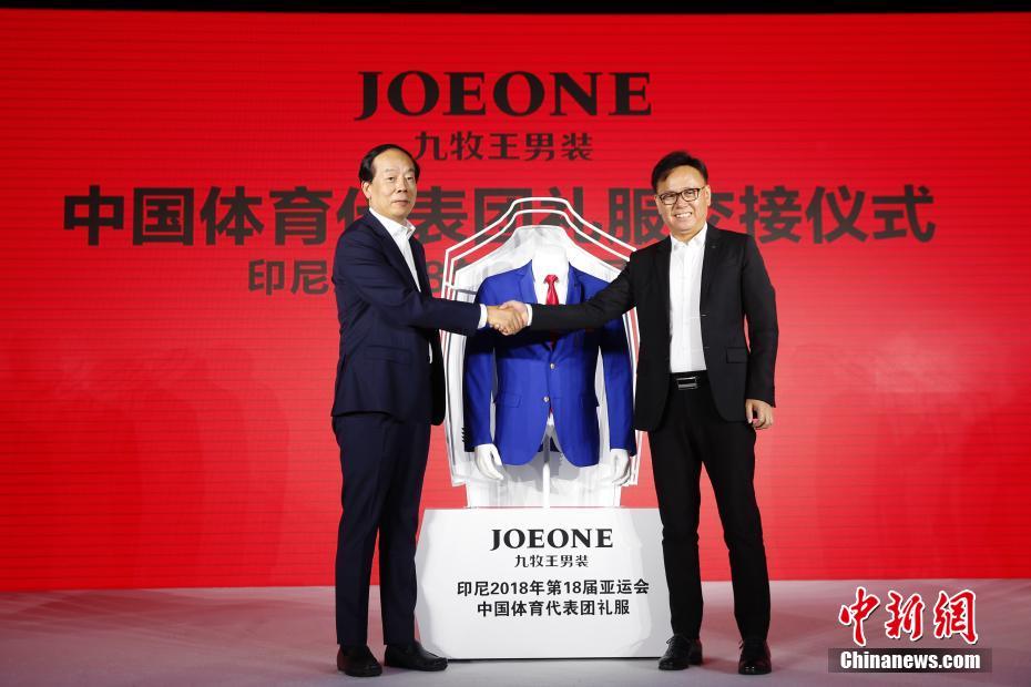 7月25日,2018年第18届亚运会中国体育代表团礼服交接仪式在北京国家体育总局举行。国家体育总局副局长赵勇、九牧王股份有限公司董事长林聪颖出席礼服交接仪式,备战印尼2018年第18届亚运会的中国队游泳运动员徐嘉余、刘湘身着新款礼服亮相。图为赵勇(左)与林聪颖交接礼服。中新社记者 韩海丹 摄