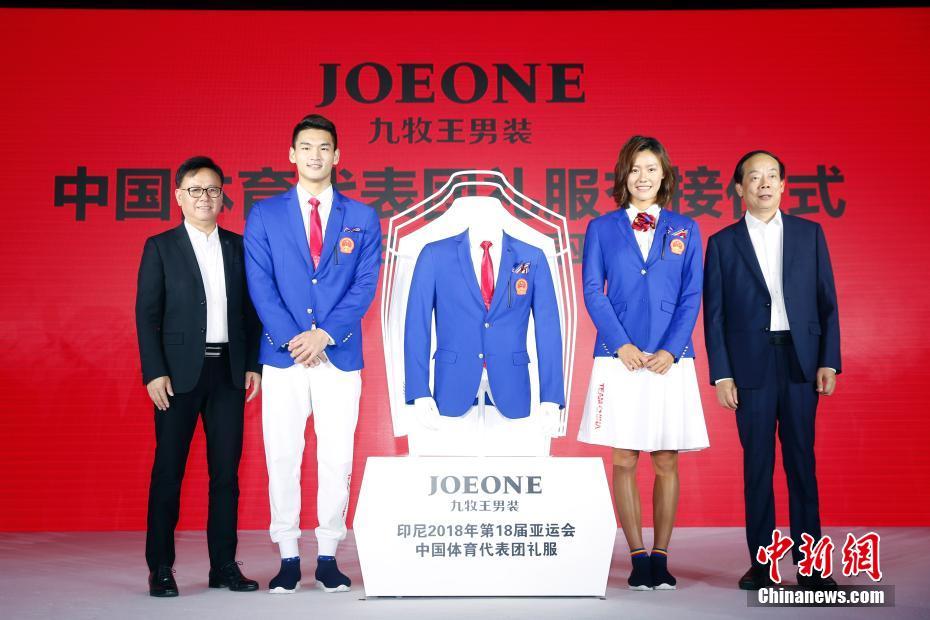 7月25日,2018年第18届亚运会中国体育代表团礼服交接仪式在北京国家体育总局举行。国家体育总局副局长赵勇(右一)、九牧王股份有限公司董事长林聪颖(左一)出席礼服交接仪式,备战印尼2018年第18届亚运会的中国队游泳运动员徐嘉余(左二)、刘湘(右二)身着新款礼服亮相。中新社记者 韩海丹 摄