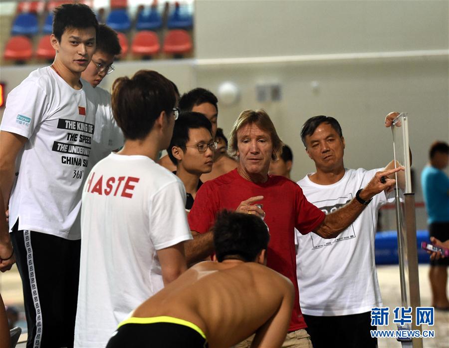 教练朱志根在泳池边的白板上记录着孙杨的成绩。外教丹尼斯则拿着两只秒表在泳池边跟随着孙杨。孙杨游完几个来回,探出水面,不时跟丹尼斯进行交流。