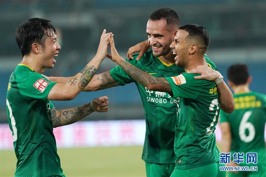 ↑8月2日,北京中赫国安队球员比埃拉(右)在进球后与队友奥古斯托(中)、张稀哲庆祝。 当日,在2018赛季中超联赛第15轮比赛中,北京中赫国安队主场以6比3战胜河北华夏幸福队。 新华社记者鞠焕宗摄