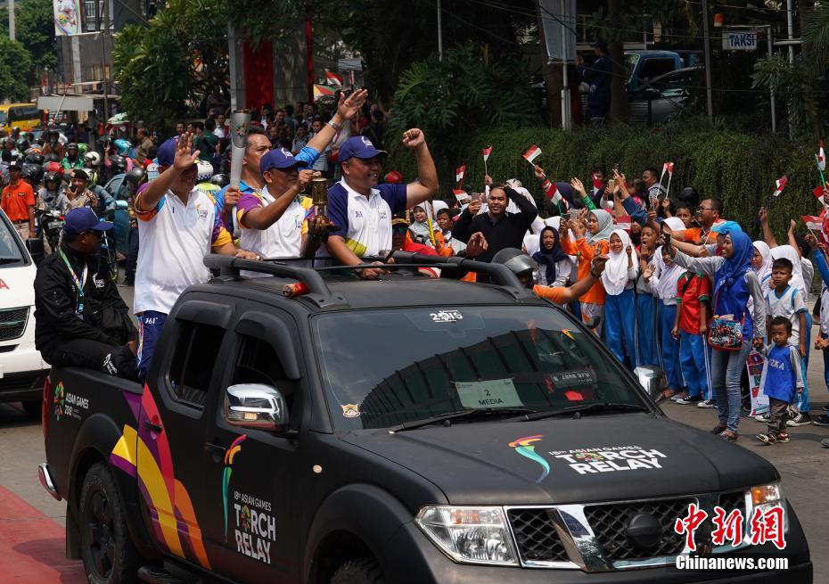 8月16日,第十八届亚运会火炬接力活动在印尼首都雅加达举行,当地民众热情迎接火炬的到来。中新社记者 侯宇 摄