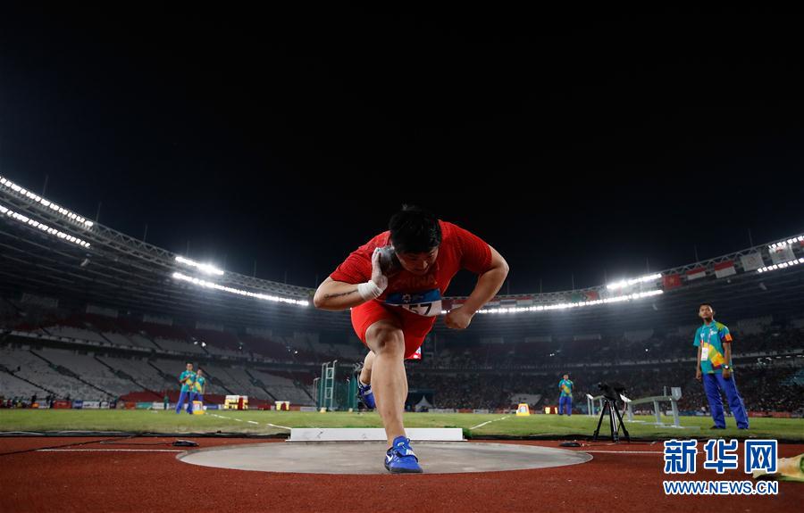 8月26日,在印度尼西亚雅加达举行的第18届亚运会田径女子铅球决赛中,中国选手巩立姣以19米66的成绩夺冠,高阳以17米64的成绩获得银牌。 新华社记者王丽莉摄。