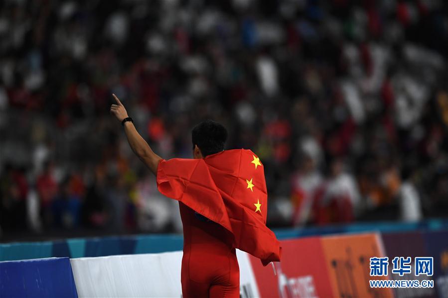 8月26日,中国选手苏炳添在比赛后庆祝。 当日,在第18届亚运会田径男子100米决赛中,中国选手苏炳添以9秒92的成绩获得冠军。 新华社记者岳月伟摄