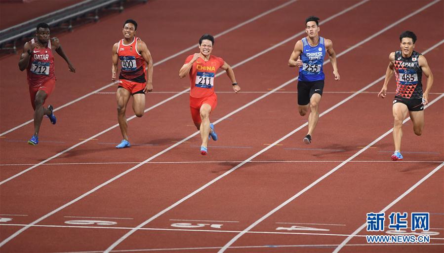 8月26日,中国选手苏炳添(中)在比赛中。 当日,在第18届亚运会田径男子100米决赛中,中国选手苏炳添以9秒92的成绩获得冠军。 新华社记者潘昱龙摄