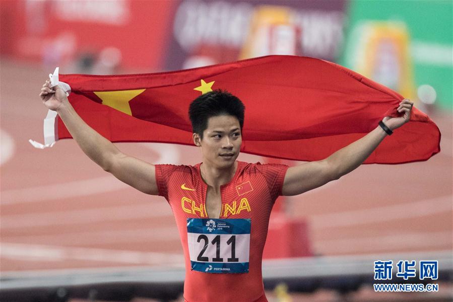 8月26日,中国选手苏炳添在比赛后庆祝。 当日,在第18届亚运会田径男子100米决赛中,中国选手苏炳添以9秒92的成绩获得冠军。 新华社记者吴壮摄