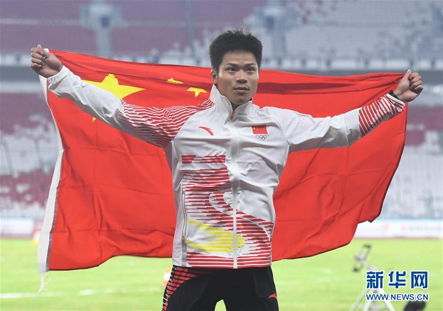 8月26日,中国选手苏炳添在颁奖仪式上。 当日,在第18届亚运会田径男子100米决赛中,中国选手苏炳添以9秒92的成绩获得冠军。 新华社记者岳月伟摄