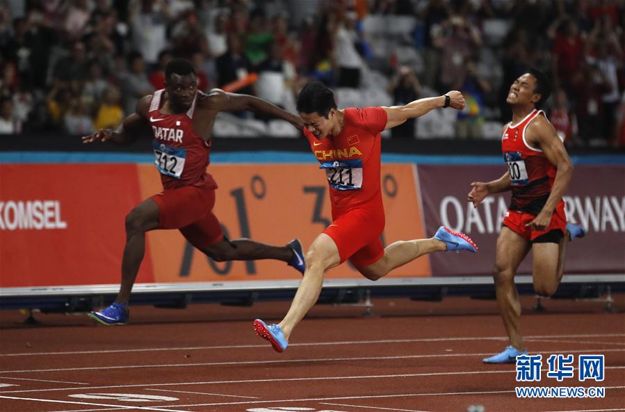 8月26日,中国选手苏炳添(中)在比赛中。 当日,在第18届亚运会田径男子100米决赛中,中国选手苏炳添以9秒92的成绩获得冠军。 新华社记者王丽莉摄
