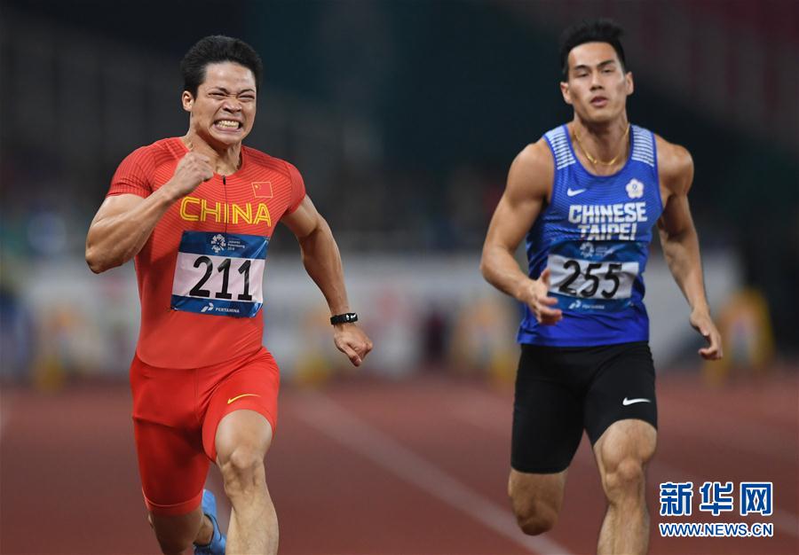 8月26日,中国选手苏炳添(左)在比赛中。 当日,在第18届亚运会田径男子100米决赛中,中国选手苏炳添以9秒92的成绩获得冠军。 新华社记者岳月伟摄