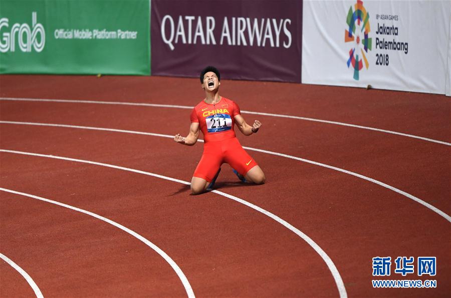 8月26日,中国选手苏炳添在比赛后庆祝。 当日,在第18届亚运会田径男子100米决赛中,中国选手苏炳添以9秒92的成绩获得冠军。 新华社记者潘昱龙摄