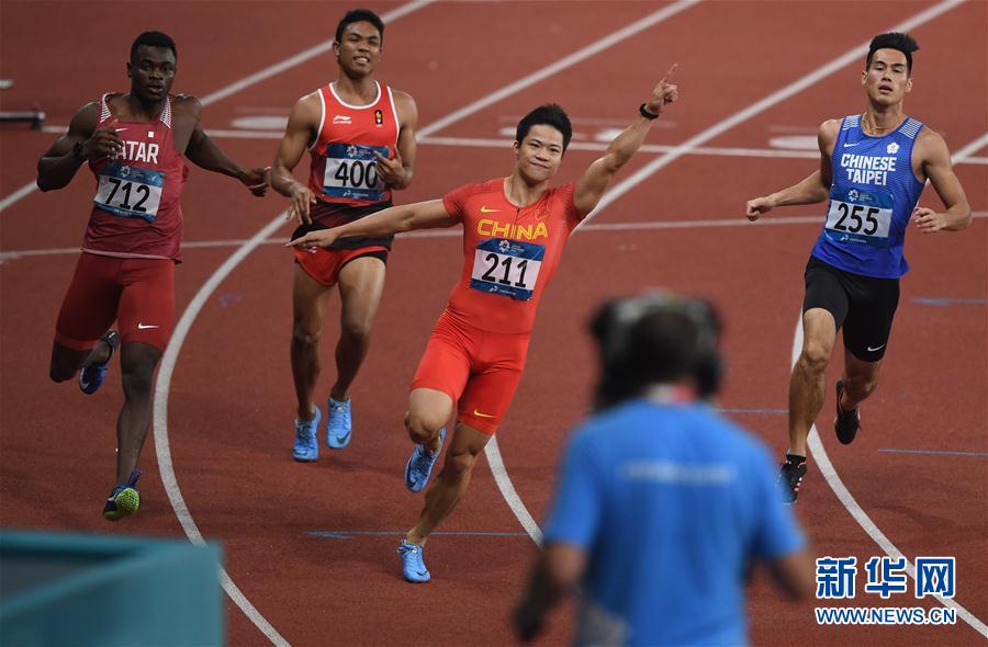 8月26日,中国选手苏炳添(左三)在比赛后庆祝。 当日,在第18届亚运会田径男子100米决赛中,中国选手苏炳添以9秒92的成绩获得冠军。 新华社记者潘昱龙摄