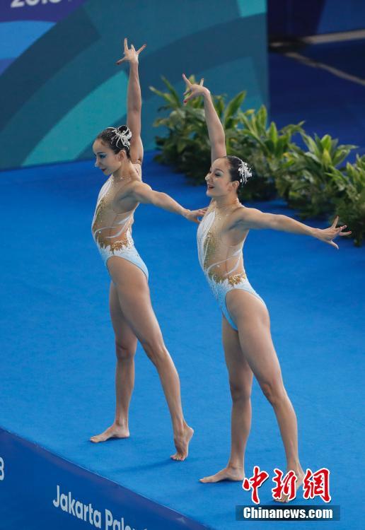 8月28日,在刚刚结束的雅加达亚运会花样游泳双人自由自选决赛比赛中,中国组合蒋婷婷、蒋文文夺冠。中新社记者 杜洋 摄