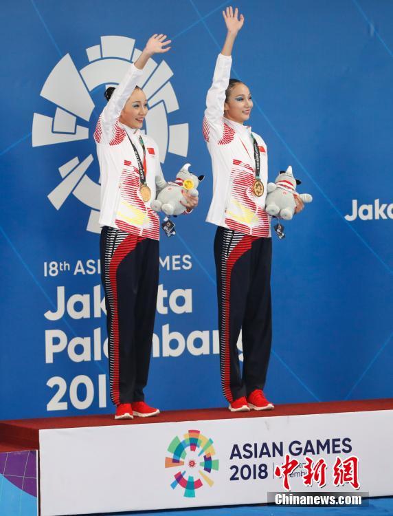 8月28日,在刚刚结束的雅加达亚运会花样游泳双人自由自选决赛比赛中,中国组合蒋婷婷、蒋文文夺冠。中新社记者 杜洋 摄