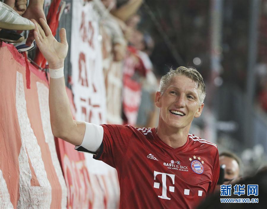 8月28日,施魏因施泰格在比赛中进球后与球迷互动。 当日,拜仁慕尼黑队在慕尼黑为曾在该队效力的德国球员施魏因施泰格举办告别赛,并以4比0战胜施魏因施泰格目前所在的芝加哥火焰队。施魏因施泰格上半场代表芝加哥火焰队出场,而在下半场则代表拜仁慕尼黑队出战并打进一球。现年34岁的施魏因施泰格于1998年便加入拜仁慕尼黑少年队,后进入一线队并一直效力至2015年。他于2017年加盟美国职业足球大联盟的芝加哥火焰队。 新华社发(菲利普·鲁伊兹摄)