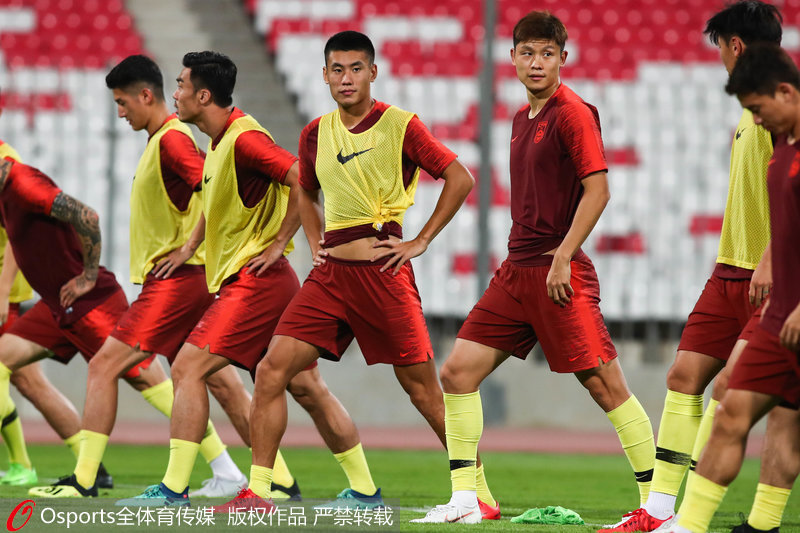 中国队踩场训练备战巴林 郑智面露微笑里皮秀颠球