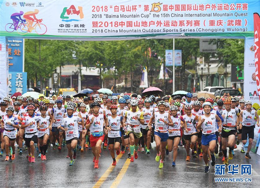 9月17日,参赛选手在起点出发。 当日,2018中国武隆国际山地户外运动公开赛在重庆市武隆区开赛。本届赛事包含越野跑、背高架、山地车、皮划艇、单绳上升、公开水域游泳等比赛项目。 新华社记者王全超摄