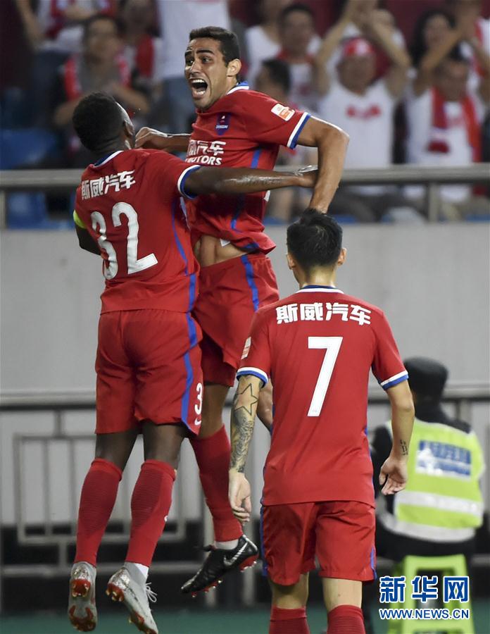 图为9月15日,重庆斯威队球员卡尔德克(中)在进球后与队友庆祝。 新华社记者唐奕摄