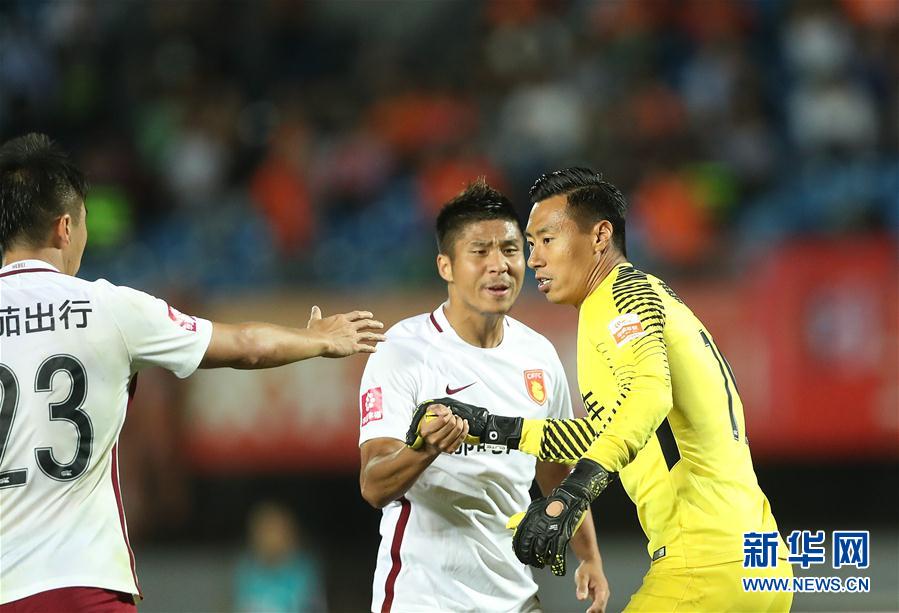 图为9月16日,河北华夏幸福队守门员杨程(右)在比赛中与队友庆祝扑出点球。 新华社记者曹灿摄